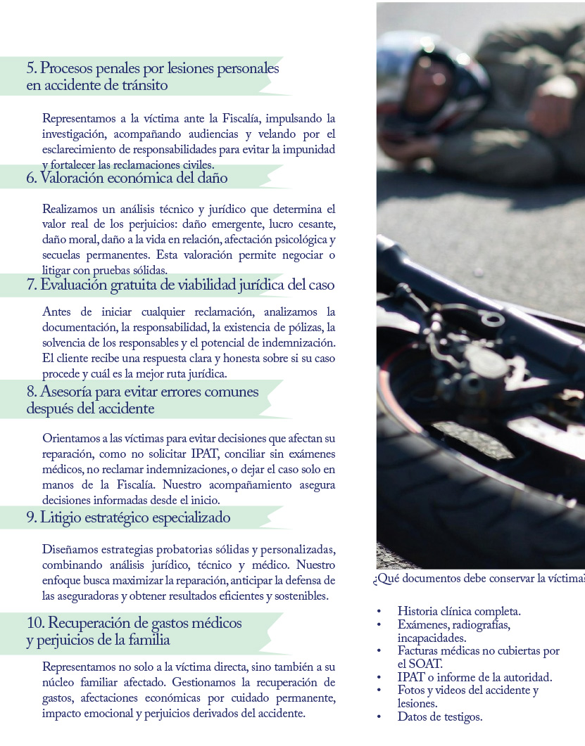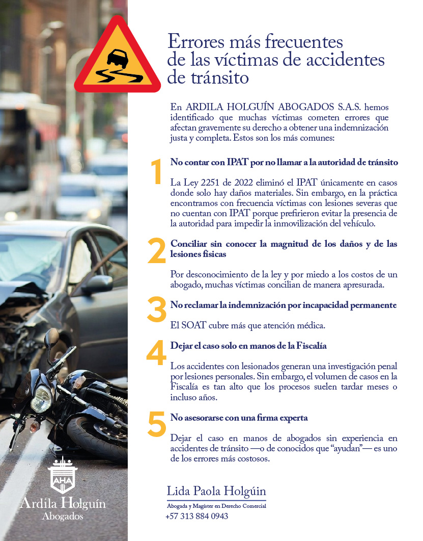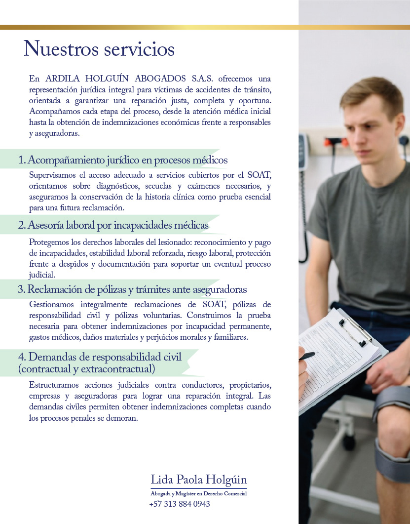 En Colombia, tras un accidente de tránsito, los derechos incluyen la atención médica vía SOAT o ADRES, la reclamación de indemnizaciones por daños materiales (daño emergente, lucro cesante) y morales, y la conciliación facilitada por la Ley 2251 de 2022, especialmente si son solo materiales, usando evidencia tecnológica para agilizar el proceso sin necesidad de IPAT policial en algunos casos